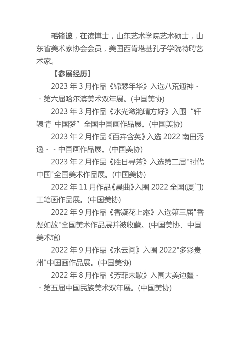 毛锋波,在读博士,山东艺术学院艺术硕士,山东省美术家协会会员,美国西肯塔基孔子学院特聘艺术家。