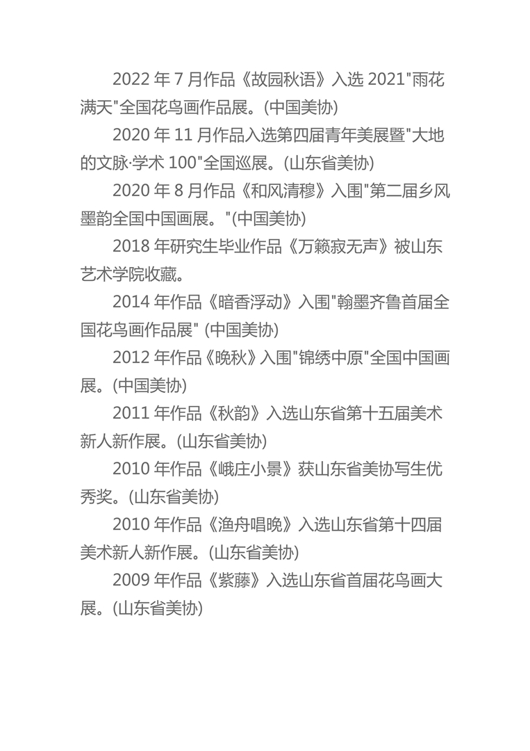 2014年作品《暗香浮动》入围"翰墨齐鲁首届全国花鸟画作品展" (中国美协)